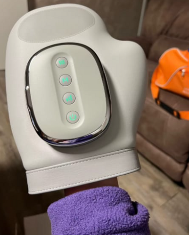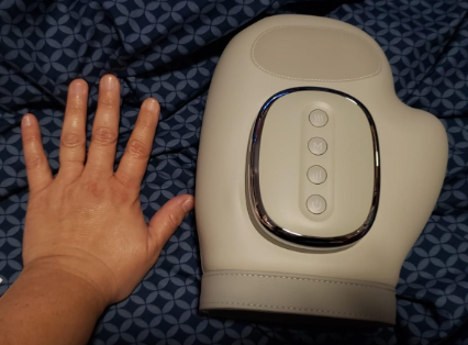 Es ist sehr einfach zu bedienen, und ich liebe, dass es selbst bei meinen großen und etwas rauen Händen perfekt passt. Beim Einschalten übt es einen angenehmen Druck aus, der meine täglichen Beschwerden lindert. Den Schmerz nimmt es nicht komplett weg, aber er wird deutlich reduziert. Außerdem gefällt mir, dass es für beide Hände (eine nach der anderen) verwendet werden kann und Löcher für jeden Finger hat. Für Reisen ist es nicht sehr praktisch, aber der Akku hält problemlos mehrere Anwendungen durch.